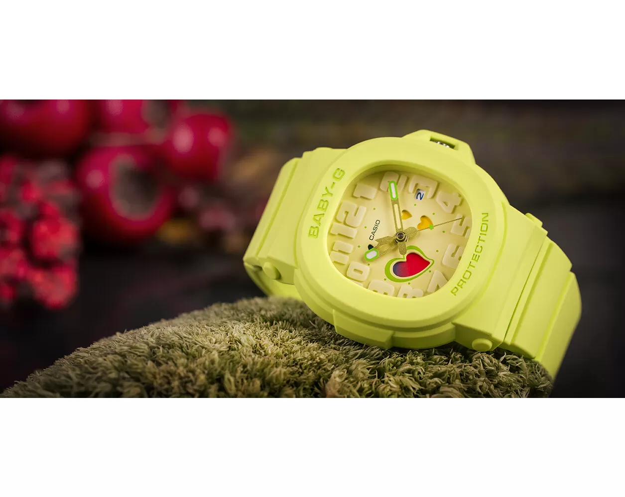 Casio Baby-G BGA-10-3AER Playful Hearts Series jsou dámské sportovní hodinky spojující ducha odolných hodinek Casio Baby-G se zábavou a hravostí s použitím hravých detailů v podobě srdce měnících svou barvu, výrazných číslic a netradiční vteřinovky. Pouzdro chrání speciální, snadno snímatelný obal.