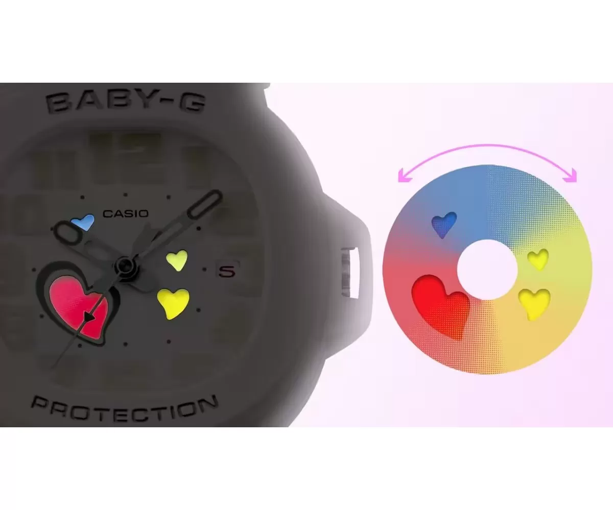 Casio Baby-G BGA-10-4AER Playful Hearts Series jsou dámské sportovní hodinky spojující ducha odolných hodinek Casio Baby-G se zábavou a hravostí s použitím hravých detailů v podobě srdce měnících svou barvu, výrazných číslic a netradiční vteřinovky. Pouzdro chrání speciální, snadno snímatelný obal.