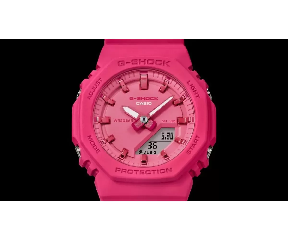Casio G-Shock GMA-P2100PP-4AER se oblékly do výrazné tmavě růžové barvy. Hodinky mají kombinovaný, analogový a digitální číselník, který zobrazuje datum, den v týdnu, stopky, budík a další funkce, které využijete při sportu a ve volném čase. Plastové pouzdro hodinek doplňuje pryžový řemínek vynikajícím vysokou odolností a dlouhou životností. Pouzdro i řemínek těchto hodinek jsou vyrobené z bio pryskyřice z obnovitelných organických zdrojů. Použité materiály pomohly snížit váhu hodinek na pouhých 40 gramů.