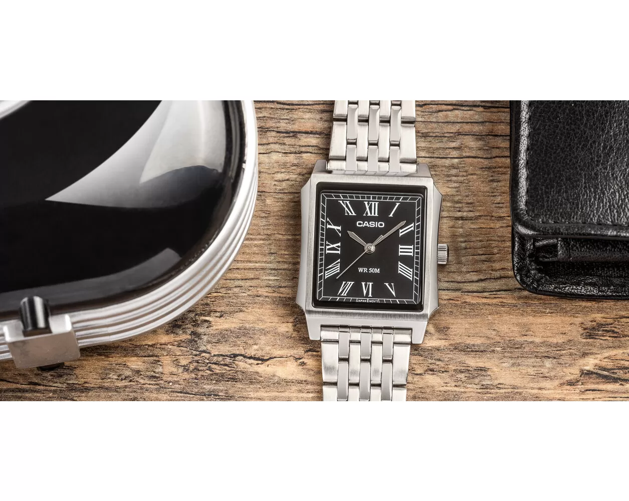 Klasické pánské hodinky Casio MTP-B190D-1BVEF z kolekce Collection. Hodinky mají ocelové pouzdro a řemínek a v kombinaci s černým ciferníkem.