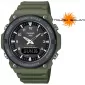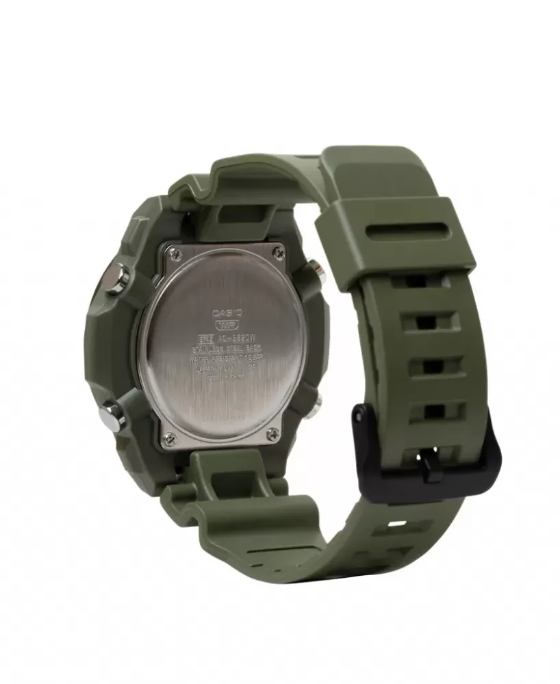 Sportovní pánské hodinky Casio Collection AQ-S820W-3BVEF s 50 mm velkým pouzdrem a řemínkem ze zelené pryskyřice zajišťující maximální odolnost, zatímco černý ciferník s oranžovým elektrickým podsvícením a digitálním displejem je chráněn plastovým sklíčkem.