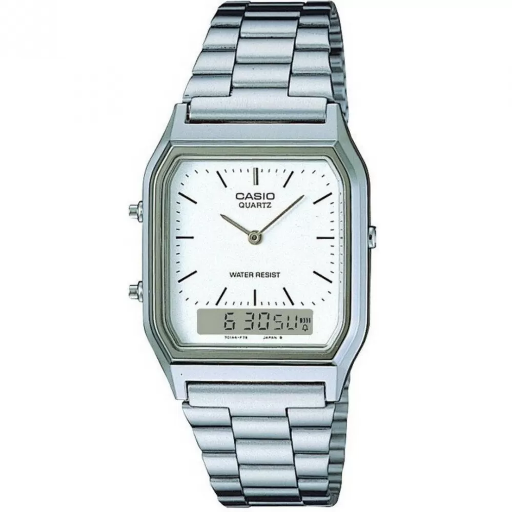 Casio AQ-230A-7DMQYES – elegantní duální hodinky s klasickým stylem. Model Casio AQ-230A-7DMQYES kombinuje analogové ručičky s praktickým digitálním displejem, čímž vytváří nadčasové hodinky plné funkčnosti pro každodenní použití. Hodinky zaujmou svým světlým ciferníkem a stříbrným nerezovým provedením, které dodávají sofistikovaný, ale zároveň nenucený vzhled vhodný do práce, do města i pro volnočasové aktivity.