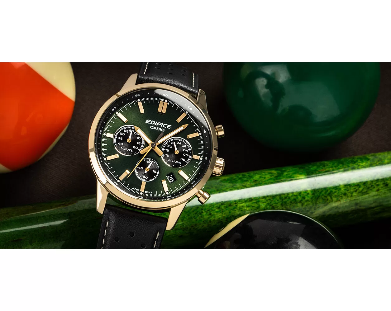 Dynamický vzhled, sportovní design, propracovaný a přehledný ciferník s chronografy. To nabízí tento model hodinek z řady EDIFICE EFR-575CL-3AEF od značky Casio. Hodinky disponují ukazatelem data a funkcí stopek. Pouzdro je vyrobeno z oceli s PVD zlacením a k němu dokonale ladí černý kožený řemínek.