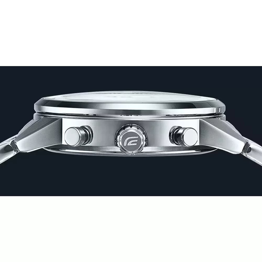 Celkový design doplňuje klenuté sklíčko, úzká luneta a ocelové pouzdro, což podtrhuje dynamický a technický vzhled celé modelové řady Edifice.