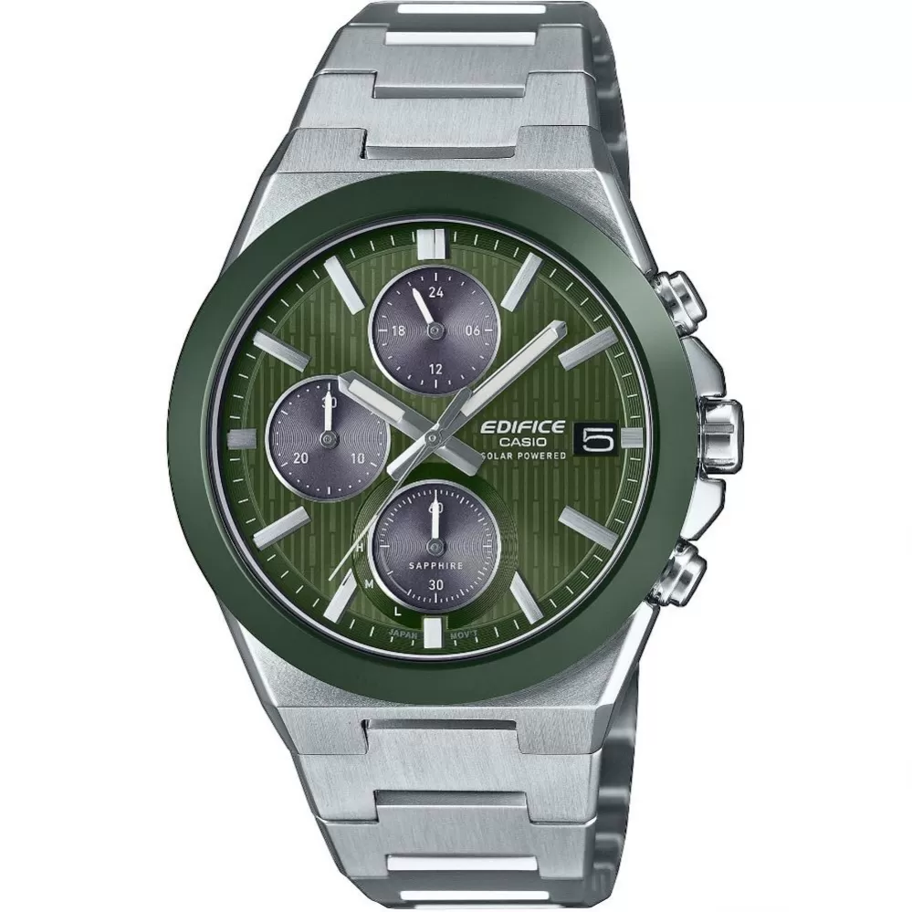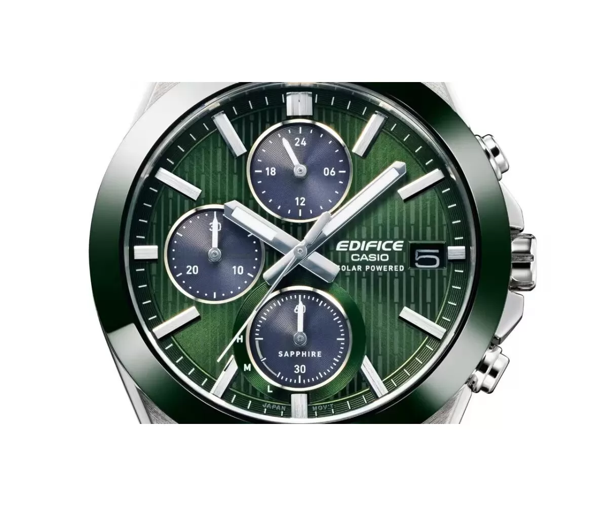 Casio Edifice EFS-S650D-3AEF – solární chronograf s výrazným zeleným ciferníkem. Model EFS-S650D-3AEF z řady Edifice kombinuje sportovní charakter, moderní technologii a elegantní ocelové zpracování. Dominantním prvkem je hluboký zelený ciferník s chronografem, který dodává hodinkám svěží, dynamický a současně sofistikovaný vzhled.