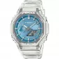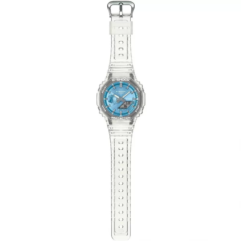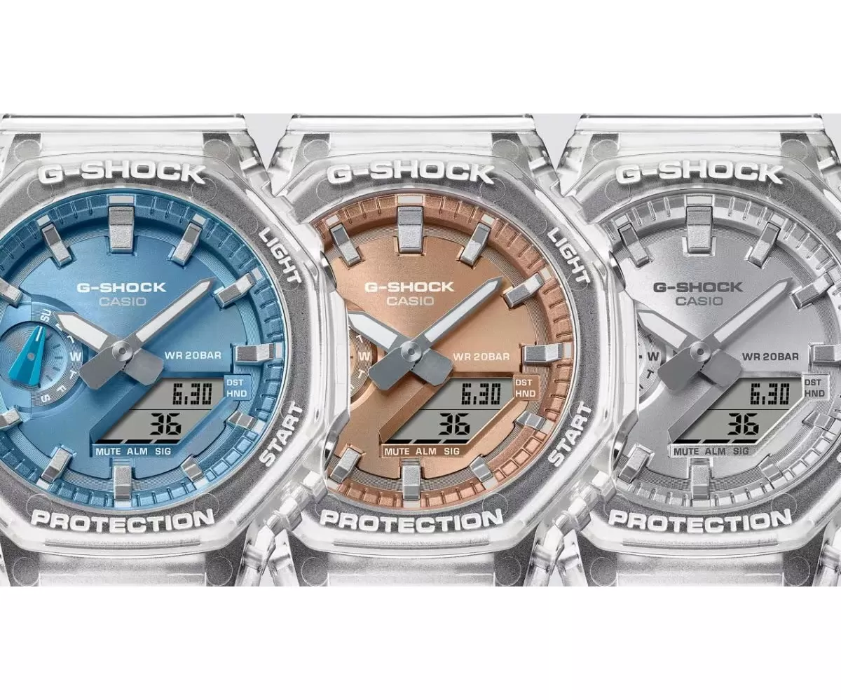 Casio G-Shock GA-2100BM-7A2ER přináší oblíbené metalické číselníky v kombinaci s populárním průhledným pouzdrem a náramkem. Hodinky mají současně tu nejvyšší odolnost. Vysoká odolnost pouzdra je zajištěna konstrukcí Carbon Core Guard. To je vyrobené z pryskyřice, vyztužené a zpevněné uhlíkovými vlákny, speciální je také konstrukce tlačítek, chránící model před průnikem nečistot. Zmíněná kombinace dovoluje vytvořit kompaktnější a lehčí celek.