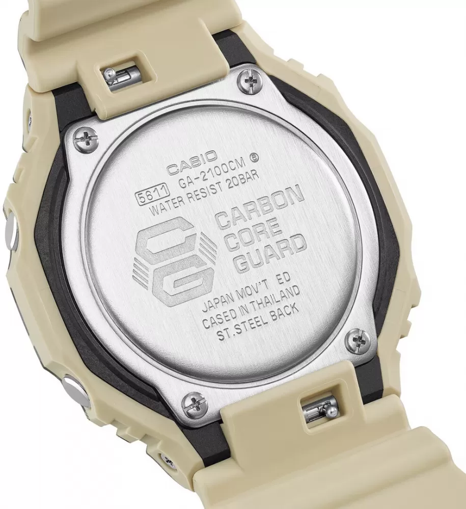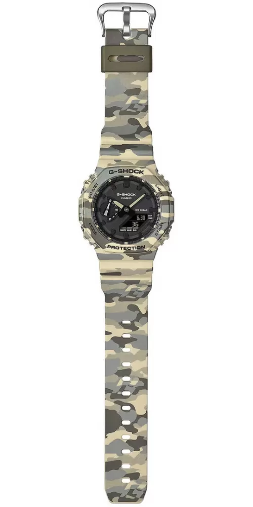Casio G-Shock GA-2100CM-5AER – moderní maskáčový design v lehkém provedení. Model GA-2100CM-5AER je součástí populární řady GA-2100, známé jako „CasiOak“ díky minimalistickému osmibokému pouzdru připomínajícímu luxusní design. Tento model kombinuje moderní maskáčový motiv s odolností G-Shock a lehkým komfortním provedením.