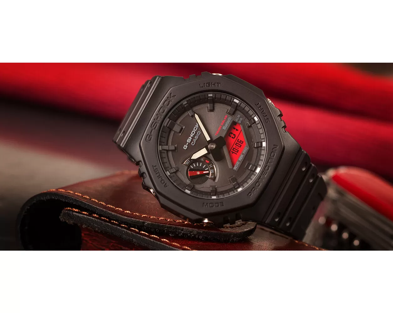 Casio G-Shock GA-B2100BBR-1AER Black and Bold Red Series jsou pánské sportovní hodinky, které mají oblíbené osmiboké pouzdro, nyní ve vylepšeném provedení s novou konstrukcí Carbon Core Guard, se solárně napájeným strojkem a možností propojení s mobilním telefonem přes Bluetooth.
