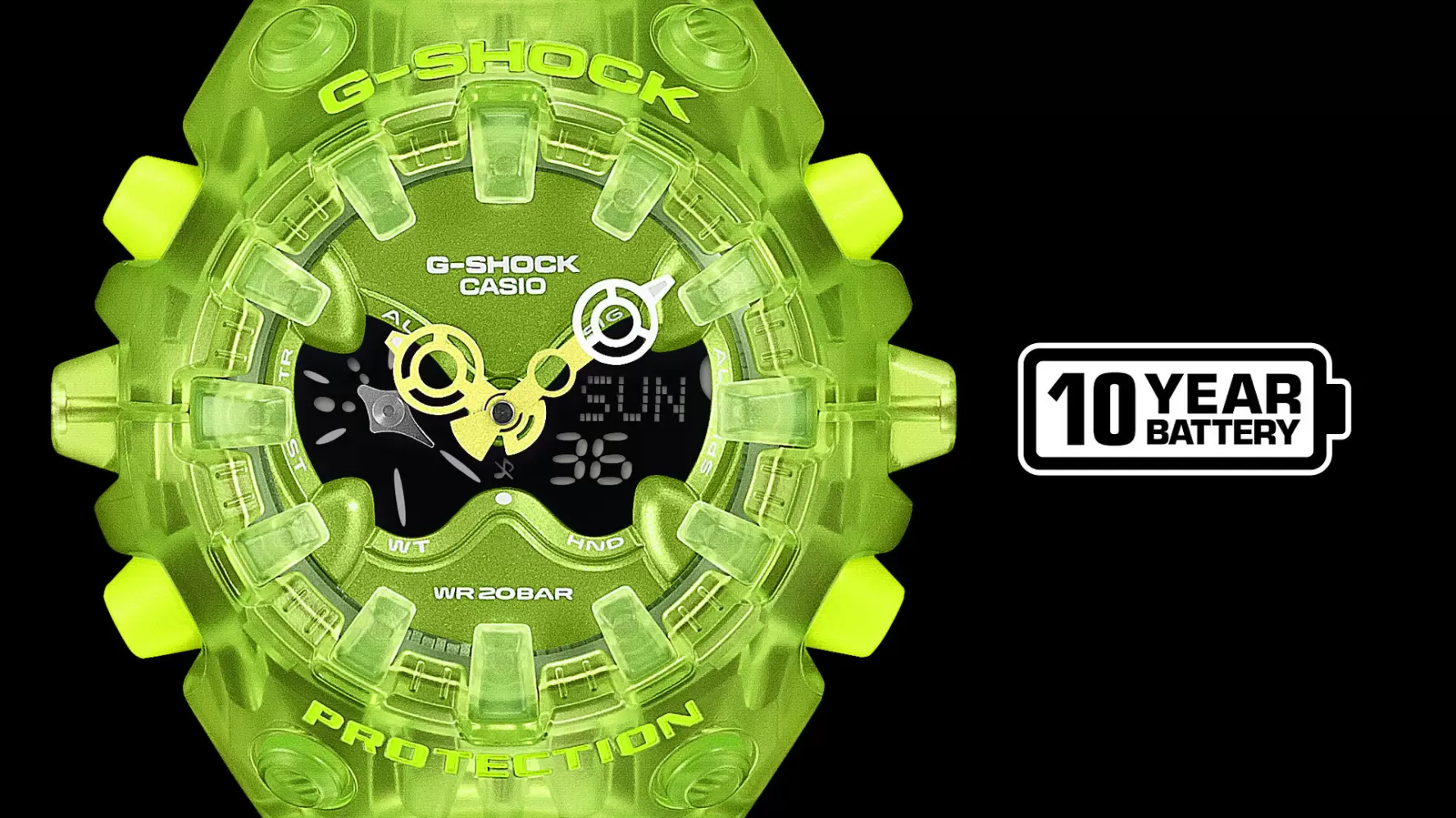 Transparentní zelené provedení dělá z GA-V01SKE-3AER výrazný lifestyle kousek. Není to klasický G-Shock – je to model pro ty, kteří chtějí experimentální design, výraznost a originalitu.