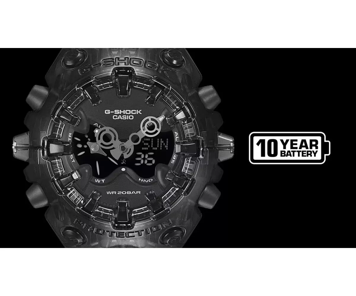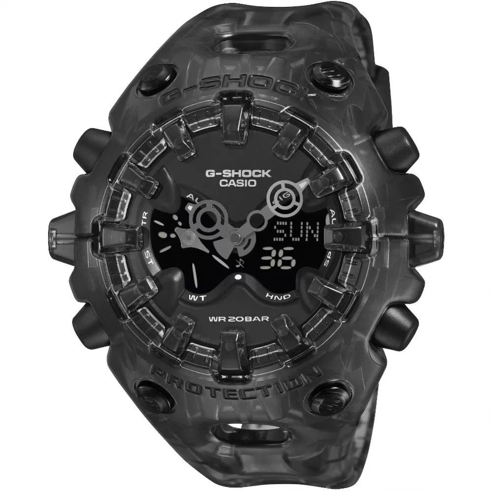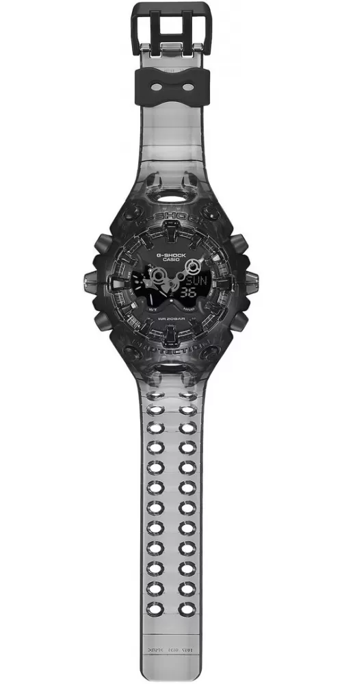 Casio G-Shock GA-V01SKE-8AER – futuristický transparentní design v šedém provedení. Model GA-V01SKE-8AER představuje výrazně experimentální přístup k designu G-Shock. Kombinuje organické tvary s ostrými technickými liniemi a doplňuje je o polotransparentní šedé provedení inspirované estetikou elektroniky přelomu tisíciletí (Y2K).