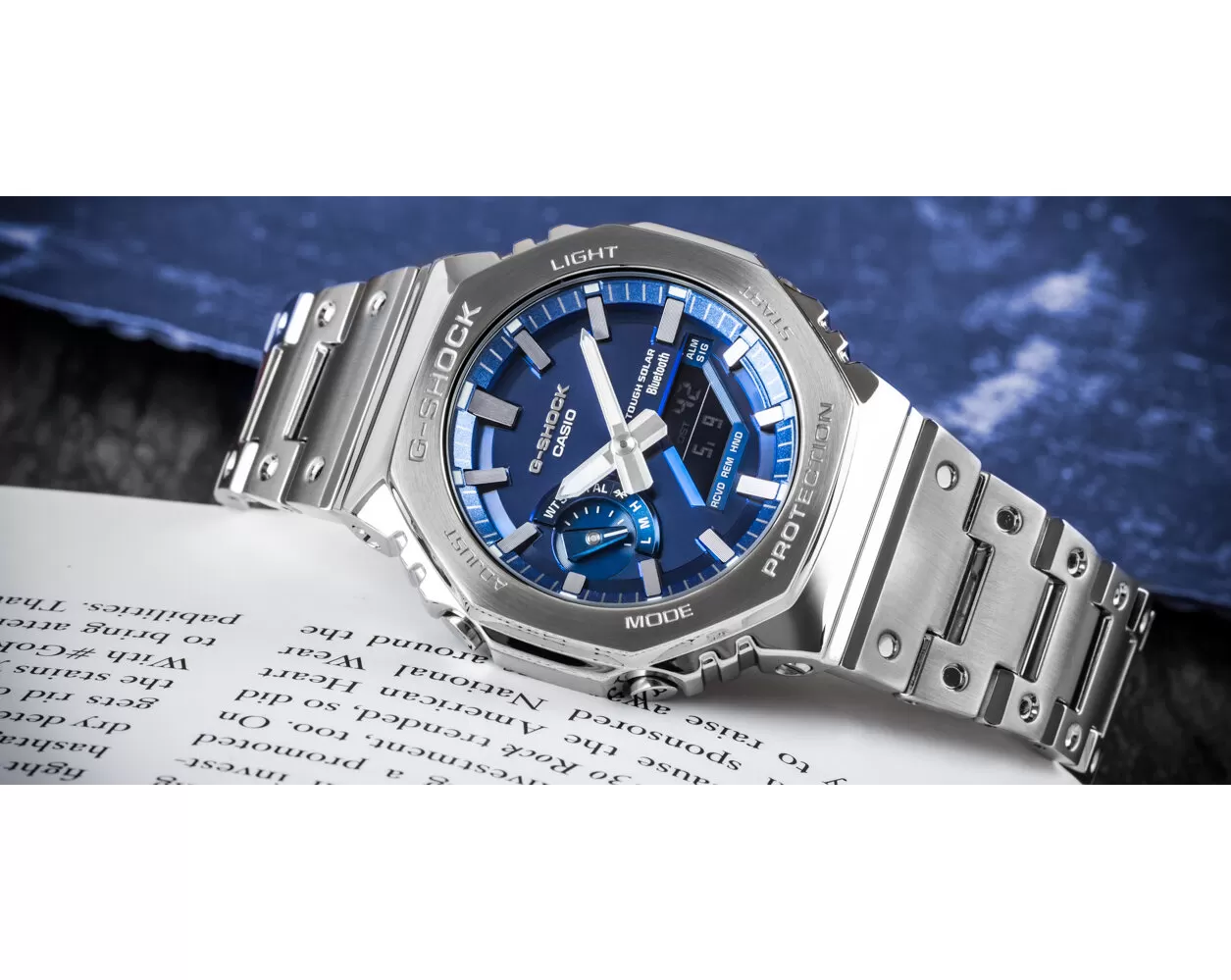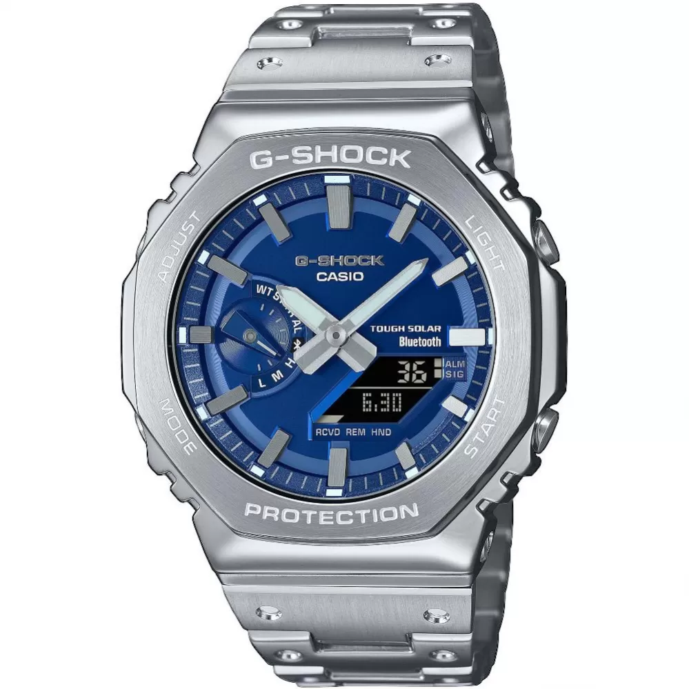 Casio G-Shock GM-B2100AD-2AER – celokovový CasiOak v elegantní modré. Model GM-B2100AD-2AER představuje prémiovou verzi ikonické řady 2100, známé svým charakteristickým osmihranným pouzdrem přezdívaným CasiOak. Tato varianta nabízí celokovové provedení z nerezové oceli v kombinaci s elegantním modrým ciferníkem, což hodinkám dodává luxusní a moderní vzhled.