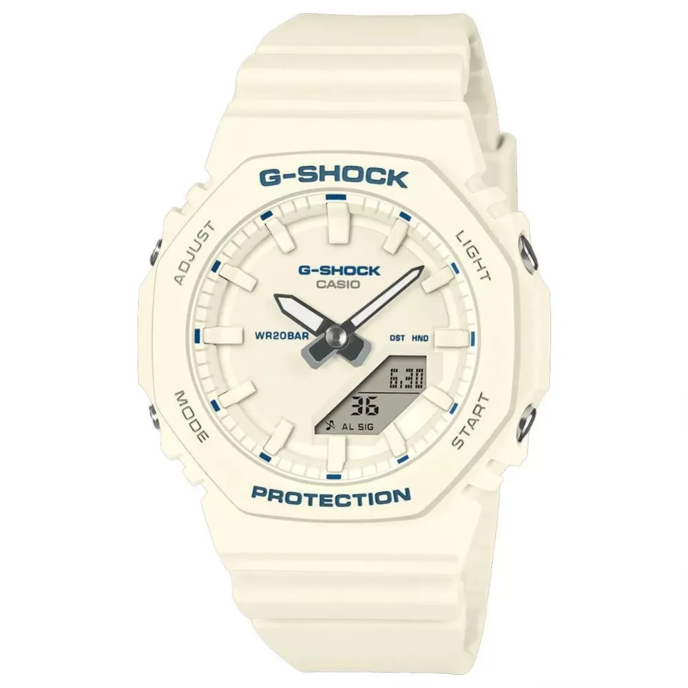Casio G-Shock GMA-P2100BA-7AER – kompaktní odolnost v čistém bílém designu. Model GMA-P2100BA-7AER přináší ikonický osmihranný design řady G-Shock v kompaktnějším a lehčím provedení, ideálním pro užší zápěstí. Hodinky zaujmou čistým bílým provedením s jemnými kontrastními detaily, které působí svěže, moderně a velmi stylově.