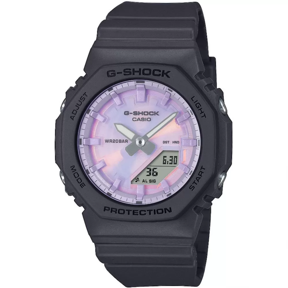 Casio G-Shock GMA-P2100PC-1AER – kompaktní odolnost s perleťovým efektem a fialovým ciferníkem. Model GMA-P2100PC-1AER přináší ikonický osmihranný design řady G-Shock v kompaktnějším a lehkém provedení, ideálním pro menší a středně velká zápěstí. Hodinky zaujmou černým pouzdrem s jemným perleťovým efektem, které elegantně kontrastuje s výrazným fialovým ciferníkem, jenž dodává modelu originální a moderní charakter.