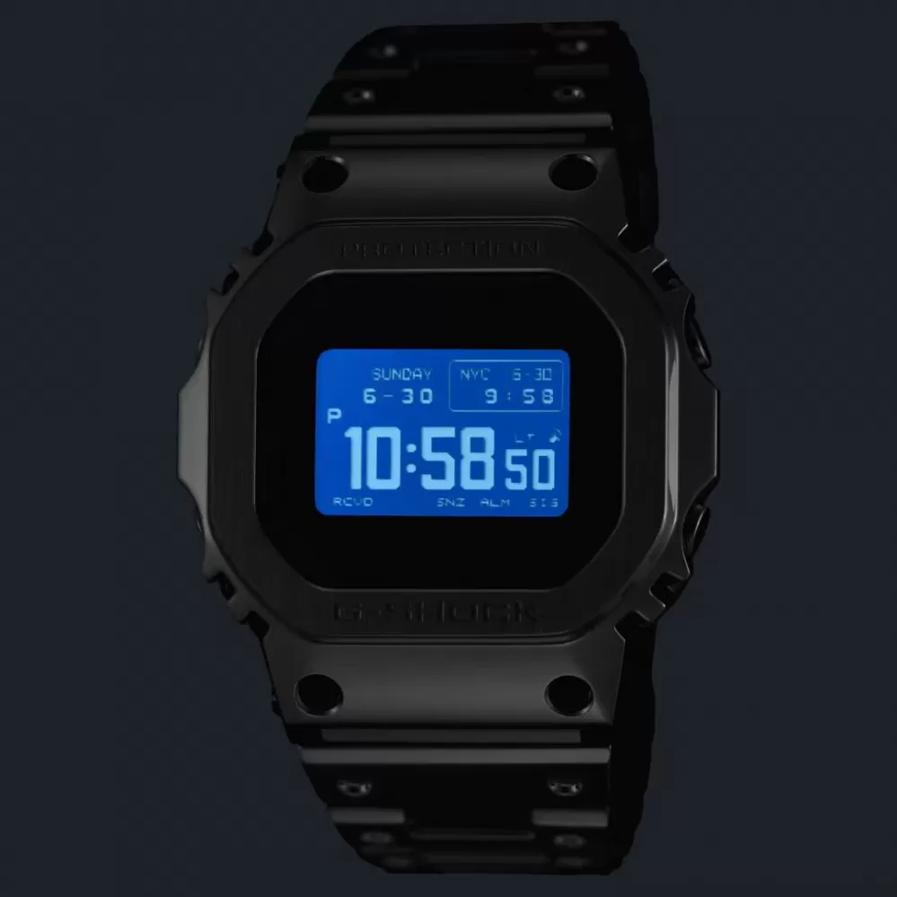 Zachovává hranatý tvar původního DW-5000, nyní však v luxusním kovovém zpracování s černým negativním displejem, který podtrhuje technický charakter hodinek.